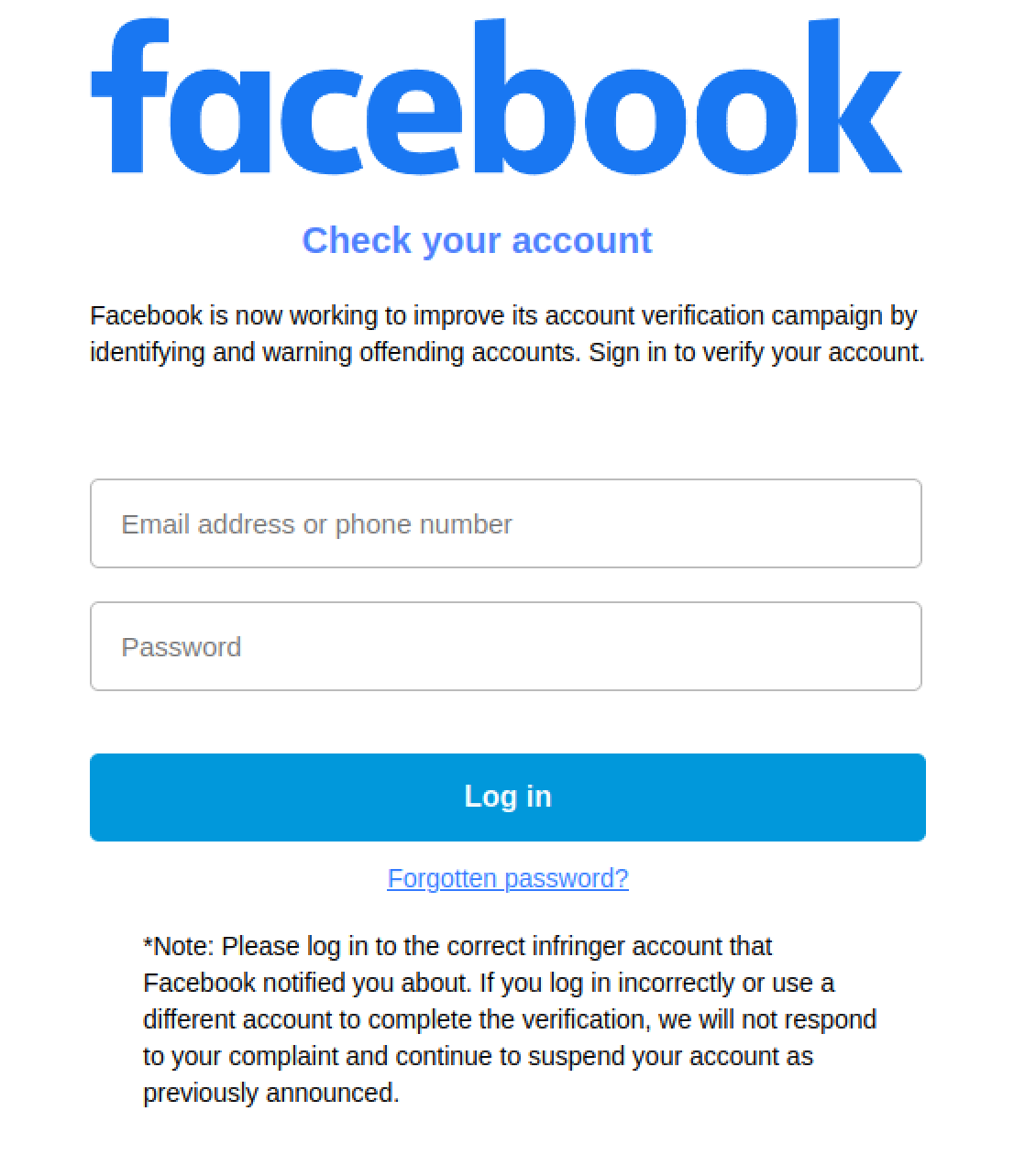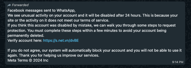 Bad actors are sending malicious WhatsApp messages and emails claiming to be facebook support that urges victims to click on a link to verify their accounts or it will be deactivated. The link takes users to a site that resembles facebook at first glance and prompts them to enter their email and password. Doing so will give attackers access to your account and recovery is likely impossible.