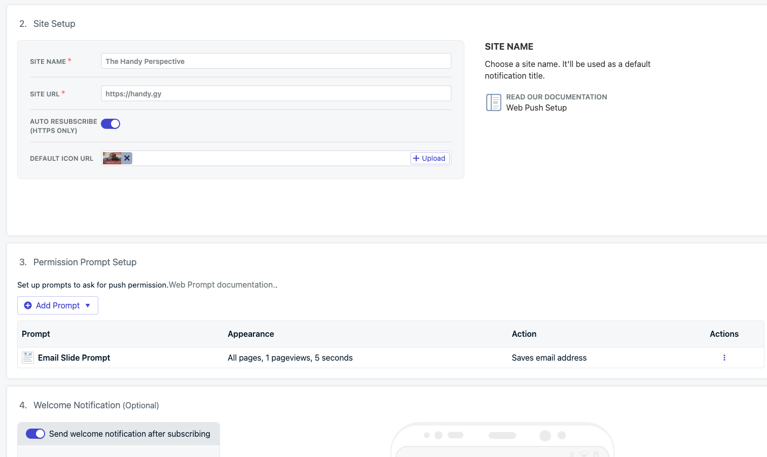 - Configure site details and under Permission Prompt Setup add an email prompt