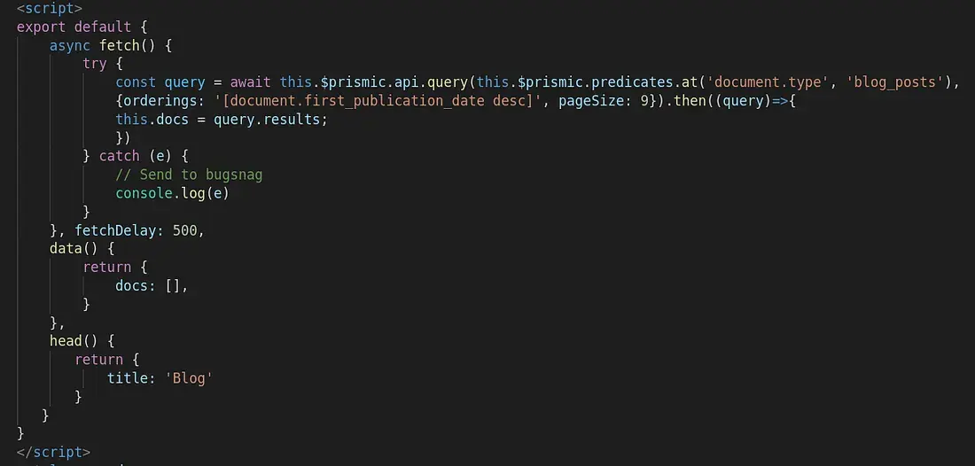 In blog->index.vue we’ll be getting and display a list of all the documents published on prismic.