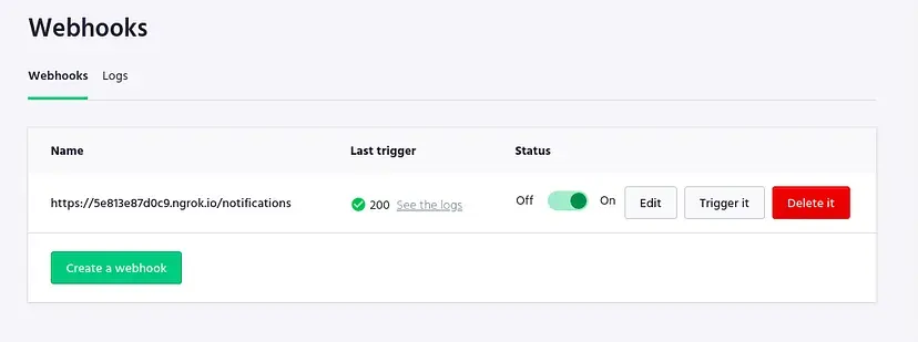 Since we’re on localhost we need to expose it to the web in order to test the webhook. For that, install ngrok then run ./ngrok http 5000 to expose the express server to the internet.